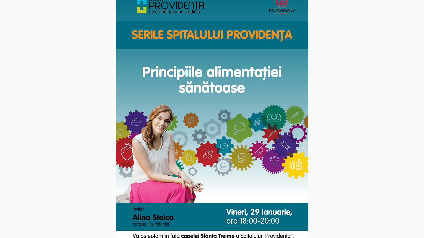 O nouă ediție a Serilor Spitalului „Providența” va avea loc vineri, 29 ianuarie a.c., începând cu ora 18:00. În cadrul acestei întâlniri, terapeutul nutriționist Alina Stoica le va vorbi participanților despre „Principiile alimentației sănătoase”.
